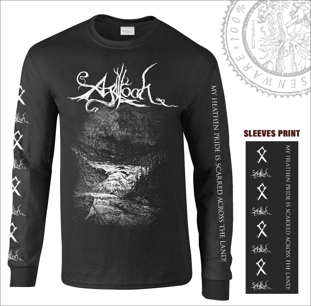 Printed on both sleeves: the AGALLOCH logo, crossed axes, and the quote "My heathen pride is scarred across the land!"