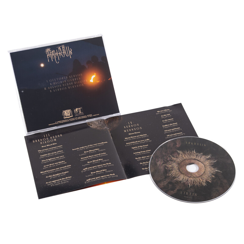 On UIHTIS (the hunt), Arkhaaik - nomen est omen- explore the theme of hunting in a Bronze Age context. The album opts for an unconventional and refreshing approach, allowing it to rise from the ranks of a concept album and ascend to a truly metaphysical, yet distinctly human experience. To achieve this, the act of "the hunt" is explored on two distinct levels: While half of the album is dedicated to the very real act of hunting an animal and the ceremonial slaughter of the sacred creature, the other half takes a different approach by exploring the theme on a transcendental level – here the sun „hunts“ the moon and vice versa.